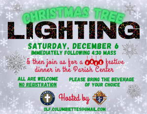 | Dec 6, 2025 | Tree Lighting and Pasta Dinner | Our Lady of Fatima, Rectory | Columbiettes |