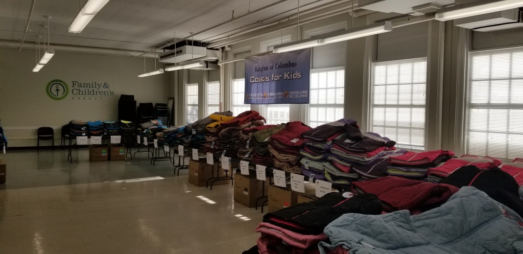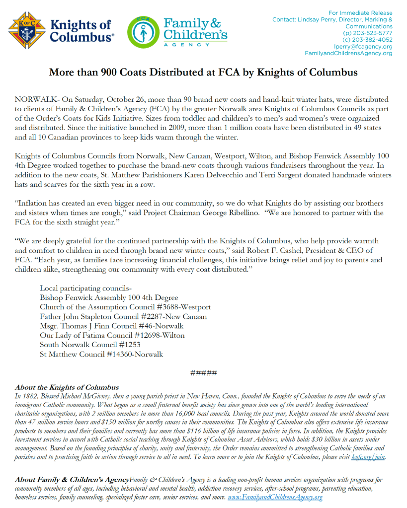 On Saturday, October 26th 2024, more than 900 brand new coats and hand-knit winter hats were distributed to clients of Family & Children’s Agency (FCA) by the greater Norwalk area Knights of Columbus Councils as part of the Order’s Coats for Kids Initiative. Sizes from toddler and children’s to men’s and women’s were organised and distributed. Since the initiative launched in 2009, more than 1 million coats have been distributed in 49 states and all 10 Canadian provinces to keep kids warm through the winter.